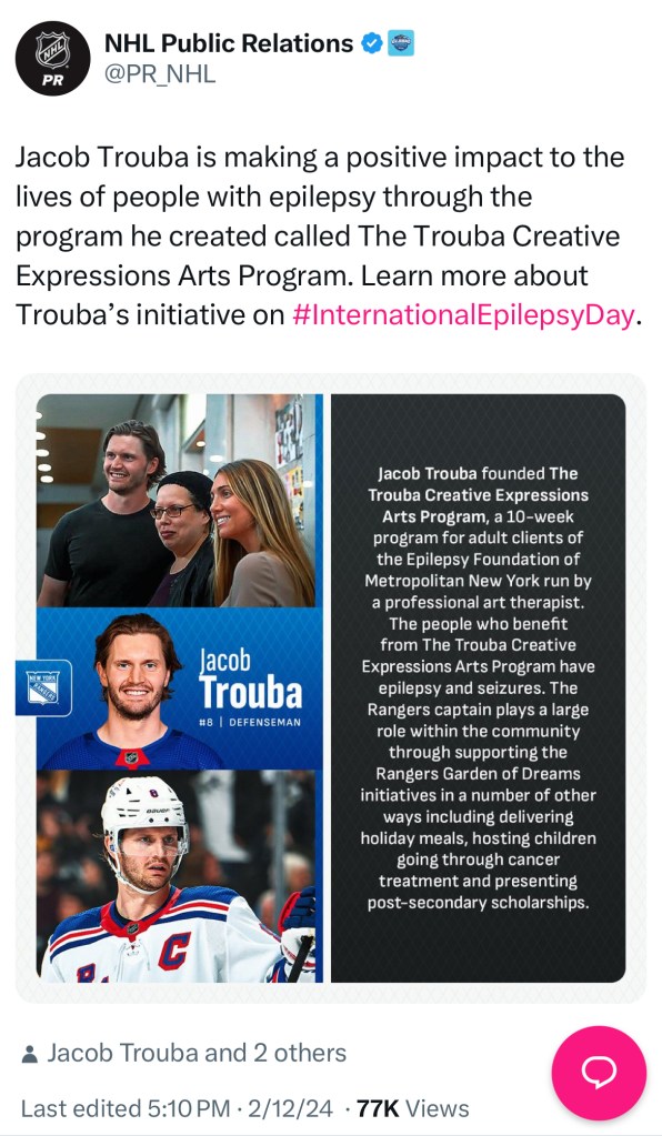 Another thing I noticed this past February. Jacob Trouba donated or painted some shit for Epilepsy NYC – His wife is a fucking doctor, and she is the photo you see below. The NHL public relations did NOT only MENTION her in the post, but didn’t even TAG HER! She knows MORE about Epilepsy than does the NHL and her husband Jacob! The reason is CLEAR why they didn’t mention her, it GOES AGAINST what the CULTURE is… and the sexism and misogyny at an ALL TIME HIGH!